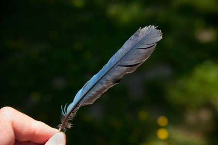 A vertical shot of a male holding a fether with blurred background