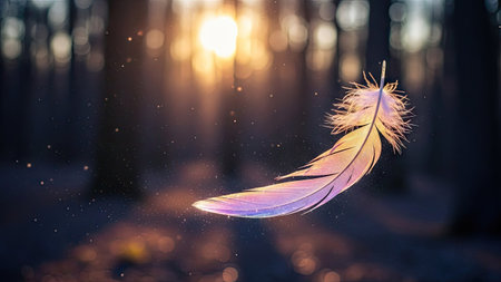 Delicate feather suspended in sunlit forest with bokeh background