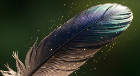 A macro close-up of a single, beautiful feather with iridescent colors of blue, purple, and green. The feather is set against a soft-focus dark green background, with magical, glowing gold sparkles floating around it. This image conveys a sense of magic, fantasy, delicacy, and beauty.