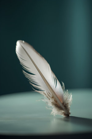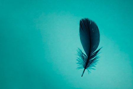 A dark feather floats on a turquoise background in a minimalist style. Space for text