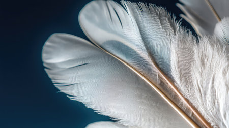 A stunning close-up image of a delicate white feather isolated on a black background, showcasing the intricate details and soft texture ideal for artistic or tranquil themes.