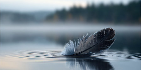 Serene Tranquil Water Surface with Feather, Creating Gentle Ripples in Dreamy Misty Environment