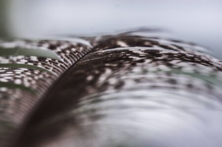 A bird's feather in macro closeup with a structure of details. Bird's feather elements isolated from background.