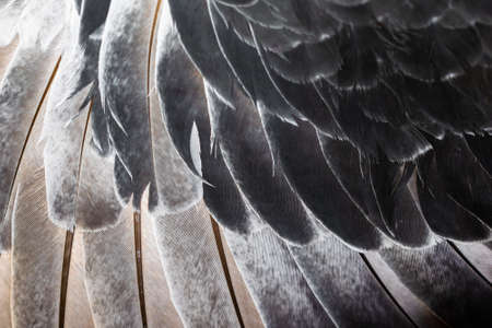 Flight feather of a bird of prey close-up. Dark brown natural background. Wallpaper with rhythmic patterns. Macro