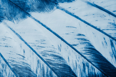 Beautiful feathers background in bright blue colors. Closeup image of colorful fluffy feather. Minimal abstract composition with place for text.