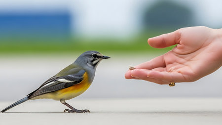 Human feeding birds outdoor. Small bird flying near person hand, helping, protecting nature. Generative AI