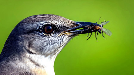 Mockingbird on a branch with a worm in its beak