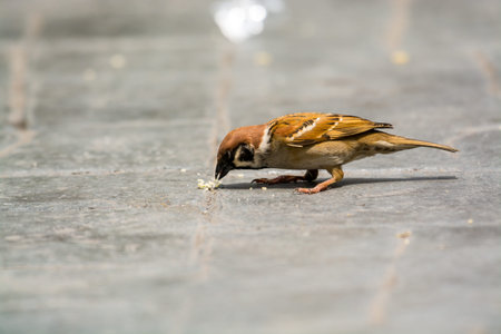 The Eurasian tree sparrow (Passer montanus) eating food, a passerine bird in the sparrow family with a rich chestnut crown and nape, and a black patch on each pure white cheek