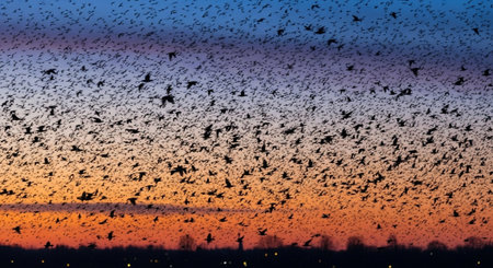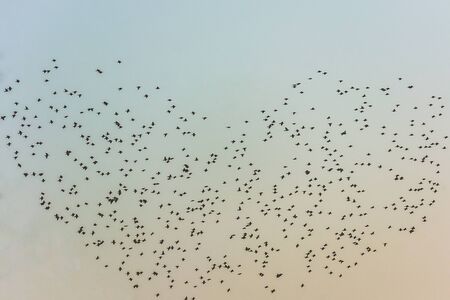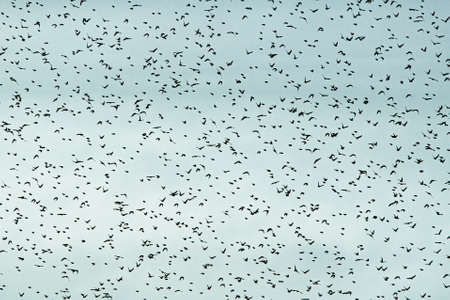 Flock of starling birds swarming at the sky, large group of animals as natural pattern