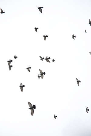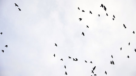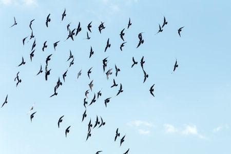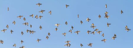 Flock of flying birds on the background of blue sky. Concept of seasonal flight of birds. Motion blur.