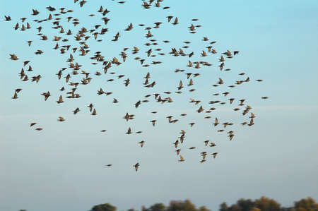 Flock of Common Starling (Sturnus vulgaris) flying with blue sky in background.