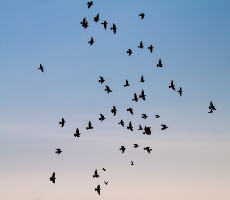 A flock of pigeons flies in the sky at sunset. The concept of freedom.