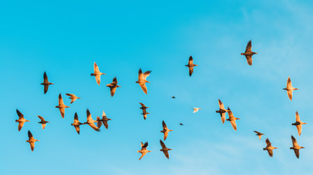A dynamic scene of numerous birds flying in formation against a bright, cloudless sky, capturing the essence of freedom and movement.