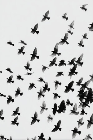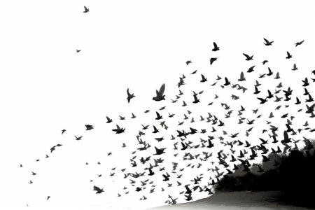 Numerous birds take flight against a bright sky, creating a striking silhouette. The scene captures the beauty of nature and the freedom of wildlife.