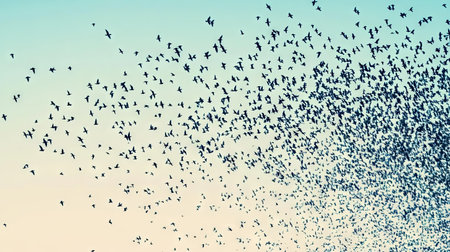 A dense flock of starlings in the sky, creating mesmerizing patterns as they swoop and dive in unison.