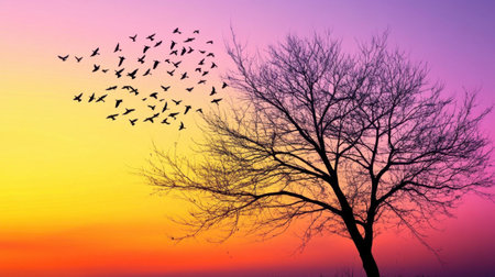 A serene twilight scene featuring a silhouetted tree against a stunning gradient sunset, with a flock of birds soaring gracefully through the sky.