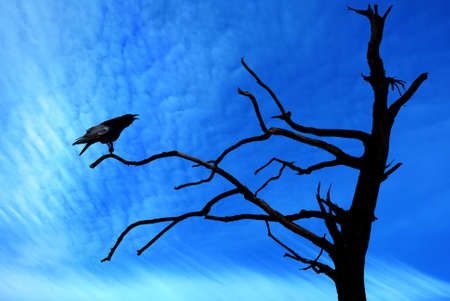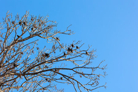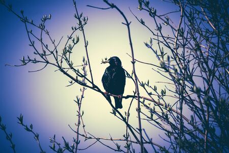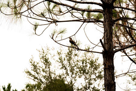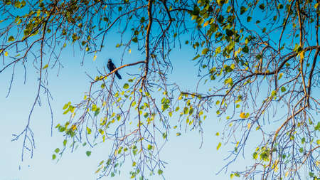 A solitary bird standing on a tree branch without leaves, looking out at the empty sky, photorealistic generative ai illustration