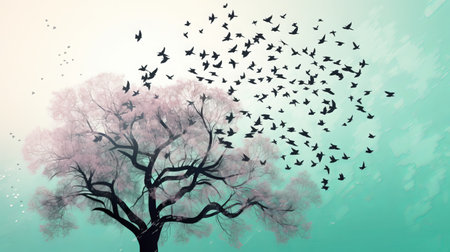 Tree with flying birds on a soft pastel colored background. Vector illustration.
