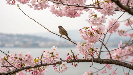 Floral background with little sparrow bird perching on branch of blossom cherry tree with flowers