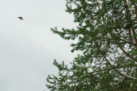 Bird in the winter forest. Beautiful winter landscape. Blue toned