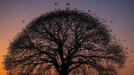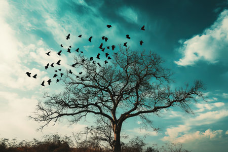 Scenic view of a majestic tree with several birds gracefully flying around its branches