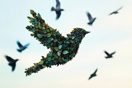 A unique bird crafted from colorful leaves flies gracefully among ordinary birds in a clear blue sky, showcasing nature's creativity and beauty