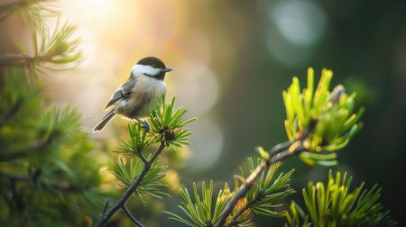 A Chickadee bird perched on a shortstraw pine branch. The small bird has a tiny beak and blends in with the evergreen larch tree