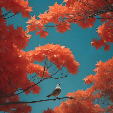 An AI generated illustration of a bird perched on a branch, illuminated by the warm autumn sun
