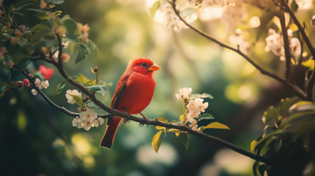 A bright red cardinal sits gracefully on a flowering branch, surrounded by blooming flowers and lush green foliage, capturing the essence of spring in a botanical garden.