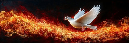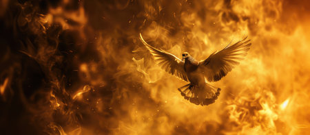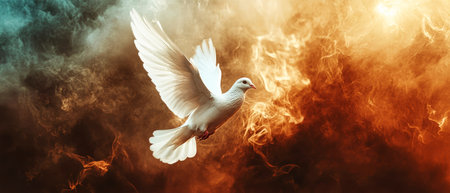 A white dove soars through a fiery sky, its wings outstretched against a backdrop of golden flames.