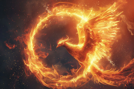 Fiery phoenix rises from ashes against a dark backdrop symbolizing rebirth and power