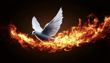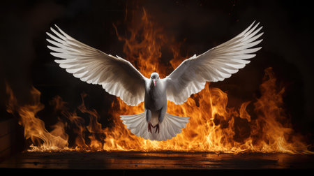 White dove with fire wings flying on black background. Symbol of faith, peace, and the holy spirit.