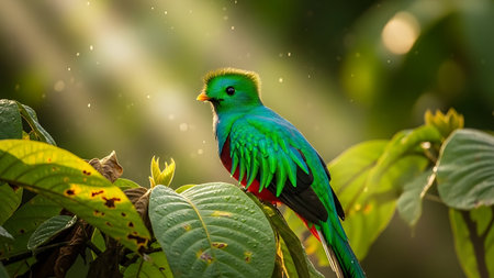A vibrant quetzal bird is seen perched on a branch, displaying its iridescent green and red plumage. The bird is set against a blurred background of green foliage. The scene features natural lighting and the image may be suitable for editorial or commercial applications.