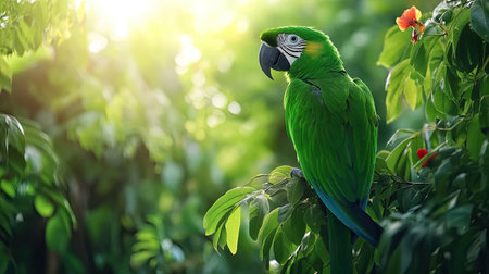 A stunning green parrot stands gracefully among vibrant leaves, basking in sunlight. This serene moment captures the beauty of tropical wildlife in a lush, natural habitat.