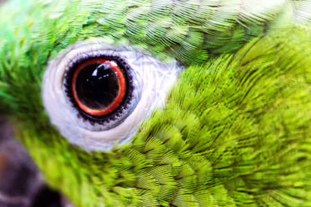 Portrait of a green bird with an orange beak and a blue eye (selective focus)