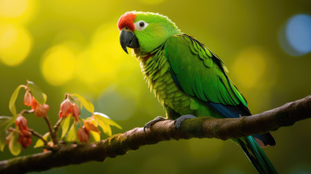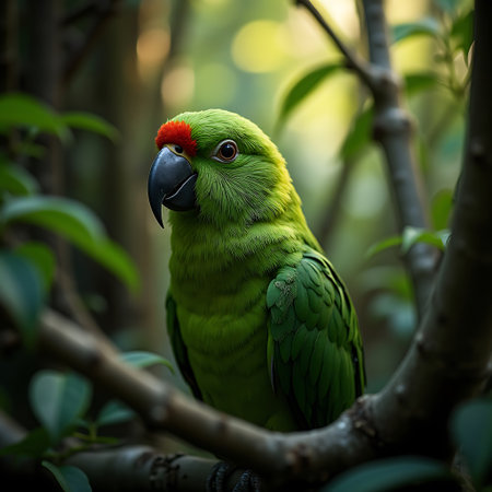 A vibrant green parrot with a red head sits perched on a tree branch amidst lush foliage, creating a peaceful scene ideal for wildlife or nature themes.
