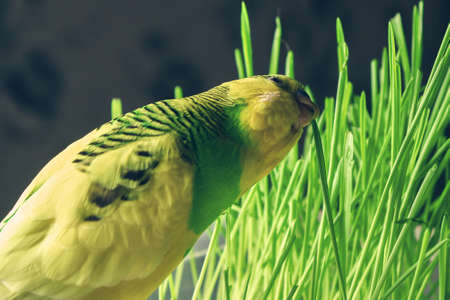 domestic parrot eat green grass with a plastic tray on a dark background. close up