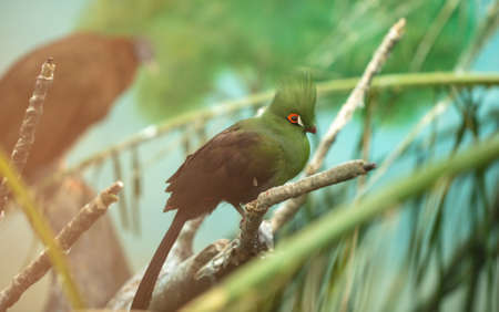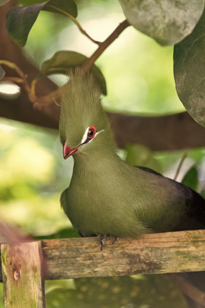 tropical exotic tauraco bird with green feather. exotic tauraco bird outdoor.