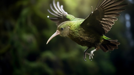 two stunning photos from the kiwis wildlife wallpaper collection showcase the captivating beauty of new zealand's birdlife. with a forced perspective and intense movement expression, these dark emerald images transport you to a late 19th-century world. shot using the canon ts-e 17mm f4l tilt-shift lens, you won't believe how breathtakingly beautiful these photos are. ai generated