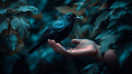 Black bird sitting on the palm of a woman's hand in the forest