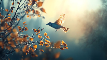 A small bird in mid-flight among bare branches, captured with the glow of sunlight filtering through
