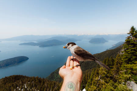 Small Madeiran chaffinch has flown to the man's hand for food crumbs and to see if he is safe. Fringilla coelebs maderensis. The experience of a lifetime. Levada dos Balcoes, Madeira, Portugal.