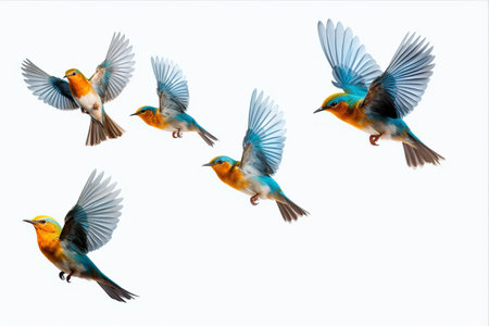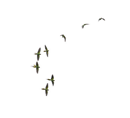 A flock of birds fly in a line across a white background. The birds are of various sizes and are spread out across the image. Concept of freedom and movement, as the birds soar through the sky
