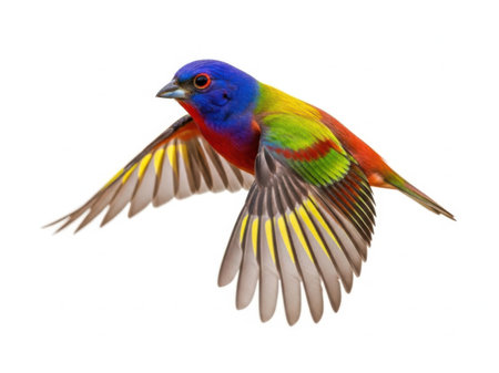 A detailed image of a vibrant bird in mid-flight, showcasing a spectrum of colors including blue, green, red, and yellow. The bird is isolated against a clean, white background, making it the focal point of the image. This high-quality photograph is perfect for nature enthusiasts and bird lovers.