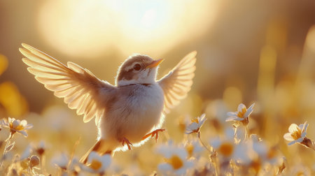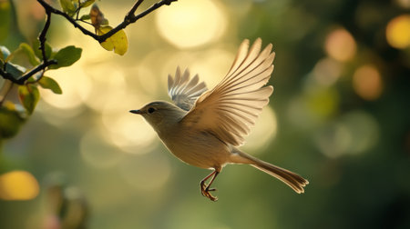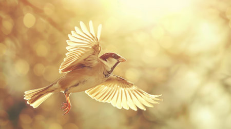 A young bird gracefully soaring through the air, highlighted by golden sunlight. The image captures the beauty of nature and the freedom of flight in a vibrant outdoor setting.