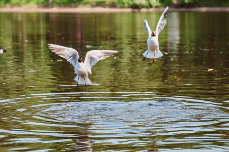 Two seagulls are flying over the water. A pair of lake birds are waving their wings over the pond