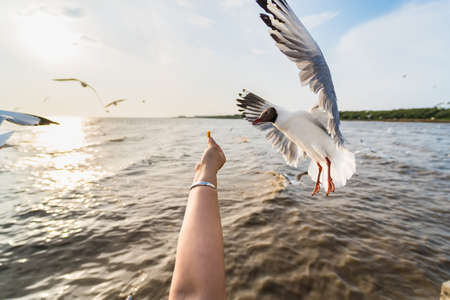 Seagull eating food in the sky from human hand at Samut Prakan, Thailand.