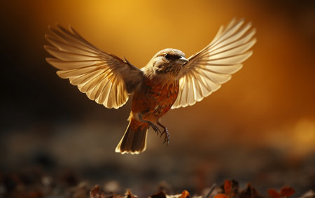 a bird soars gracefully through the air, its wings outstretched in a magnificent display. bathed in a golden light, the image captures the bird's multilayered dimensions with a touch of subtle irony. shot with a zeiss batis 18mm f2.8 lens, the photo exudes a soft realism, showcasing a beautiful contrast between dark yellow and light bronze tones. ai generated