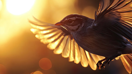 A stunning close-up capture of a small brown bird softly spreading its wings, showcasing delicate feathers against a blurred sunset backdrop, evoking tranquility.