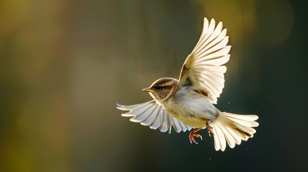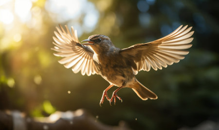 A dynamic close-up of a sparrow with wings spread wide, captured in mid-flight with precision.